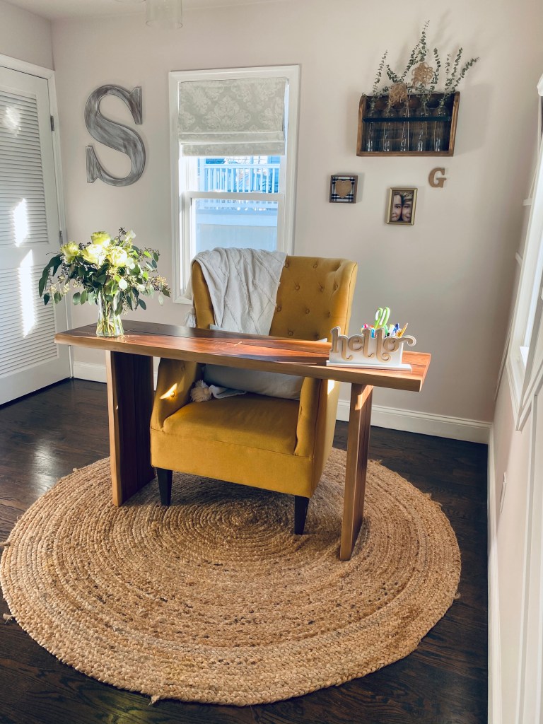 This room being on a smaller scale easily appeared congested visually. After ditching my bulky desk & rectangular rug for a console table & round jute rug I find myself less frustrated visually and its so much easier so clean around. Smaller rooms can look spacious given the opportunity and the roundness of the rug adds a welcoming softness you won’t regret.