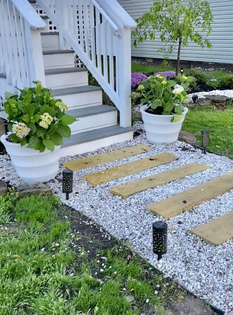 Second, I put a light layer of rock down and then the boards. Doing this I made sure the boards were centered and slightly elevated especially from the sides so that the water can run off. Safety first, aside from the pooling looking rough, potentially making its way back to your foundation area can add to potential water issues.